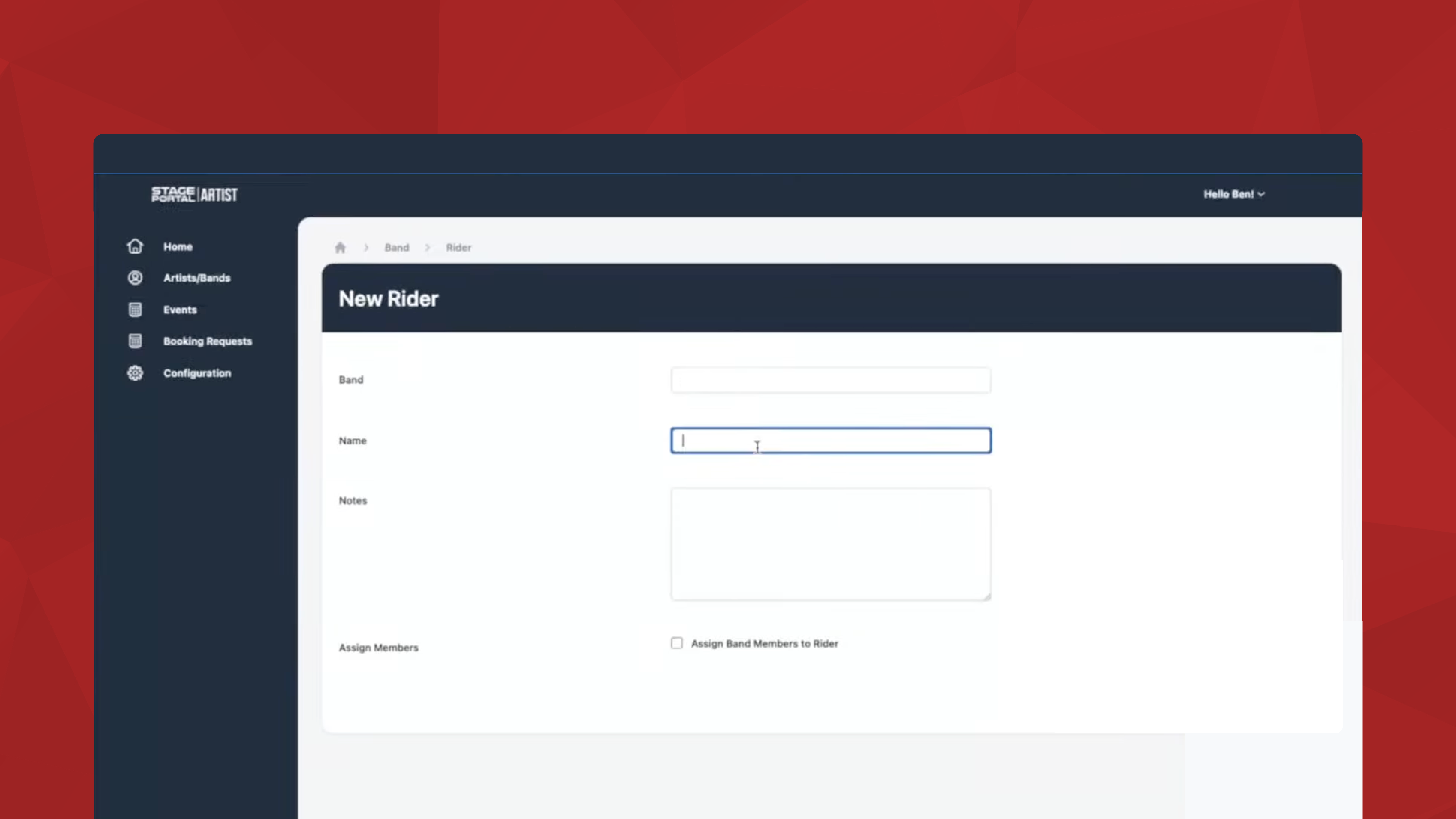 When creating your rider you will be asked to give the rider a name, for example ‘local gig rider’, and add any notes about the rider.